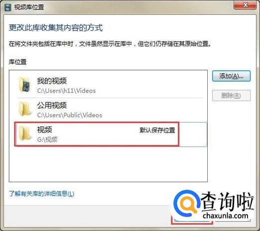 在弹出“视频库位置”对话框中我们能看到有两个保存位置都是C盘,点击右边的“添加”按钮。