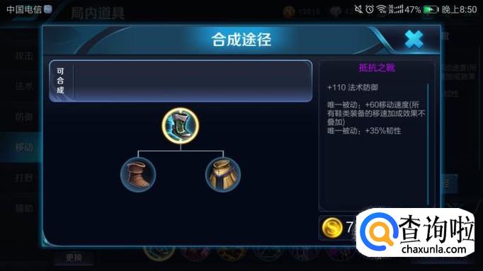 抵抗之靴(法术防御+110),被动技能:+60移动速度,+35%韧性。