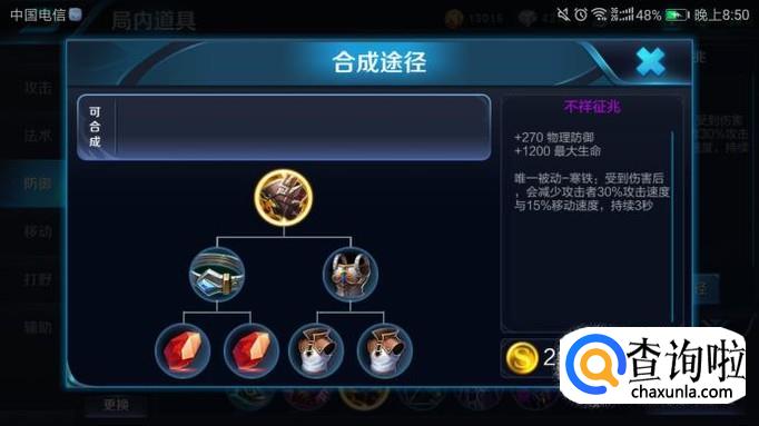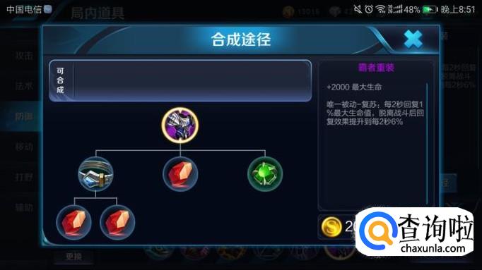 霸者重装(最大生命+2000),被动技能:每2秒回复1%最大生命值,脱离战斗以后回复效果提升到每2秒6%。出到这件装备的时候,表明,你们已经到游戏的后期了,这个时候不死才是关键!因为这个时候,哪怕仅仅死一个英雄都可能代表着,你方的水晶会被推掉!