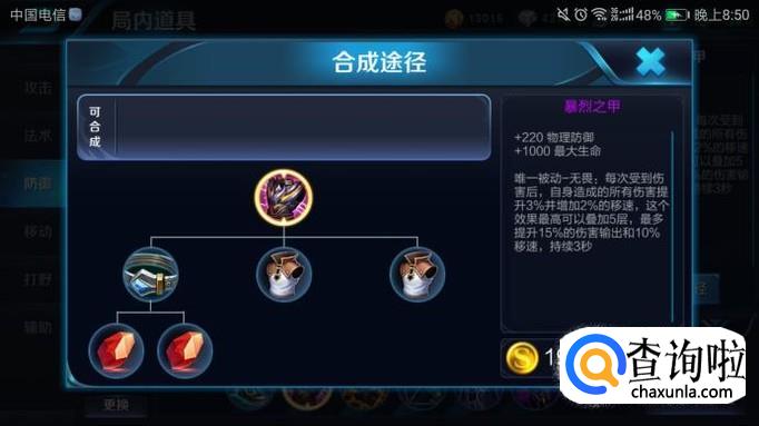 暴烈之甲(物理防御+220,最大生命+1000),被动技能:每次受到伤害后,自身造成的所有伤害提升3%,移动速度+2%,值得注意的是这个效果可以叠加5层持续3秒!