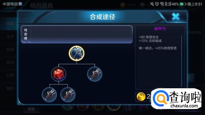 破甲弓(物理攻击+80,冷却缩减+10%),被动技能:增加45%物理穿透。有一定程度上的肉,就要注意攻击值的提高,毕竟,关羽是战士,而不是坦克!全部出肉,那是不现实的!