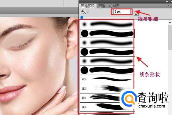然后在切换画笔工具对话框,我们选择一种画笔的形状以及对应的画笔粗细,分别画出眼睛闭合时的眼线部分以及眼睫毛形状,效果如下图二所示...