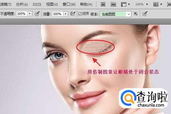 目前我们可以看到美女的双眼是静态的睁开状态,假如我们想让右侧的眼睛形成动态的眨眼效果,那么首先在左侧工具里找到“仿制印章工具”,如下图;