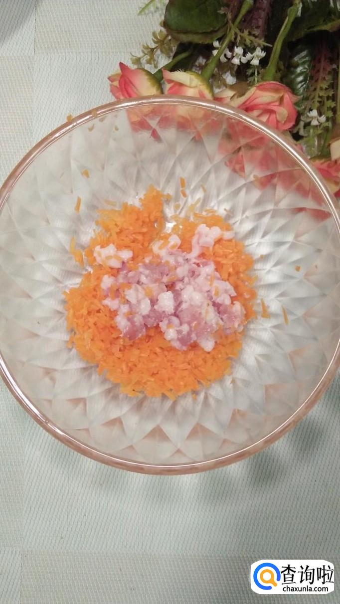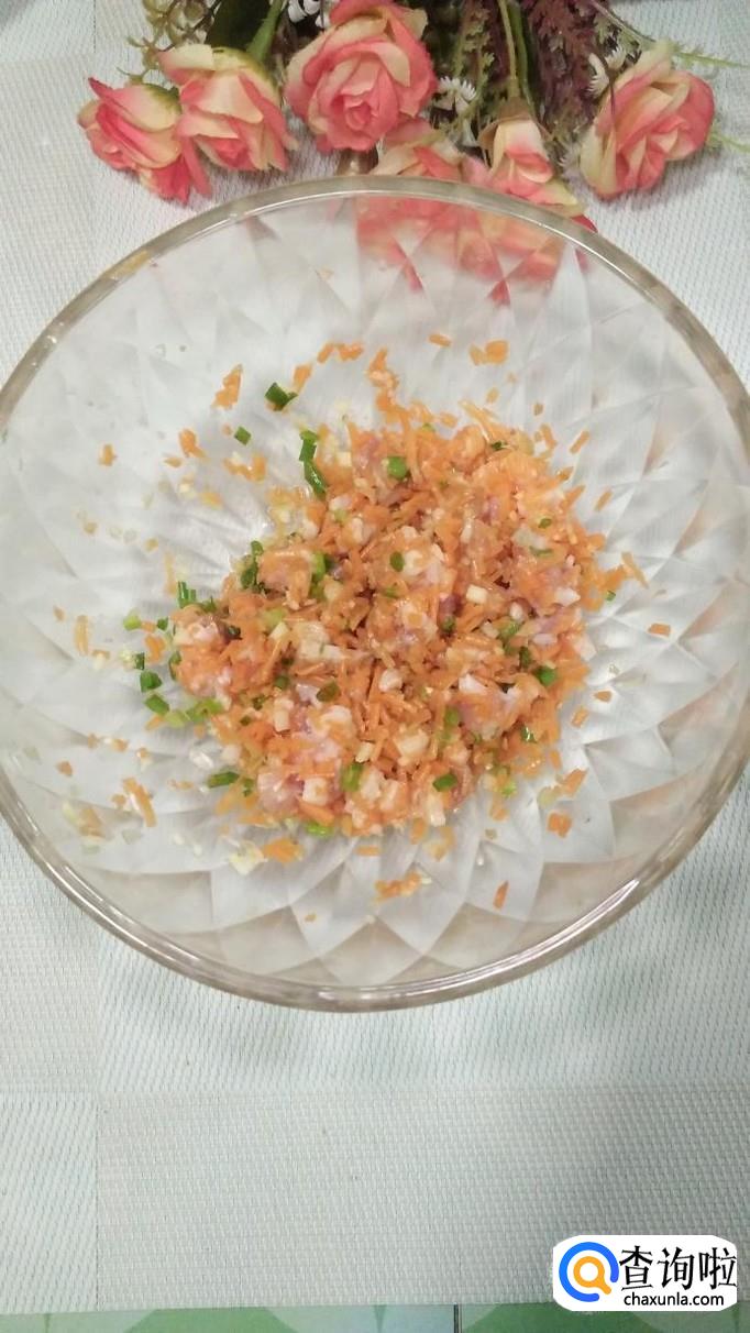 将焯过水的胡萝卜切碎,放入五花肉碎。
