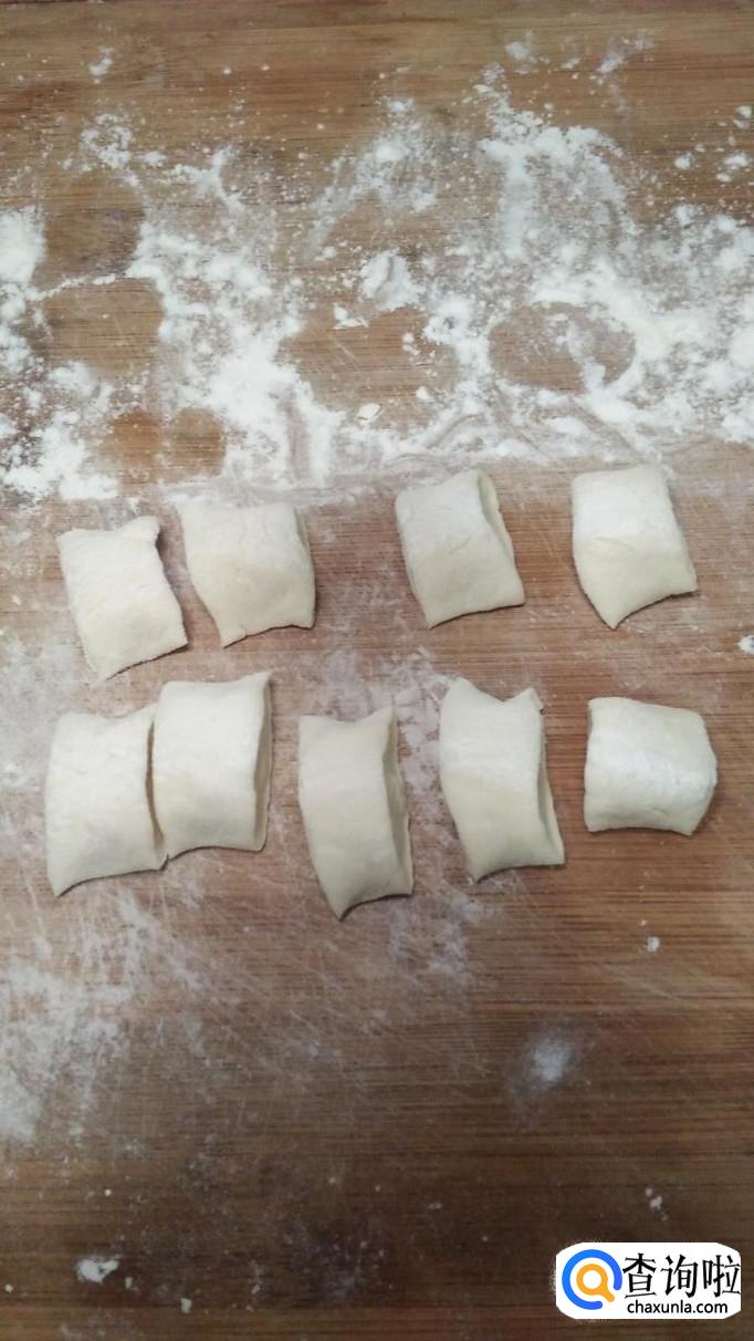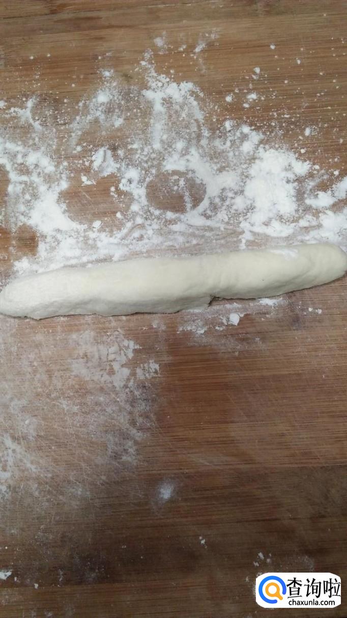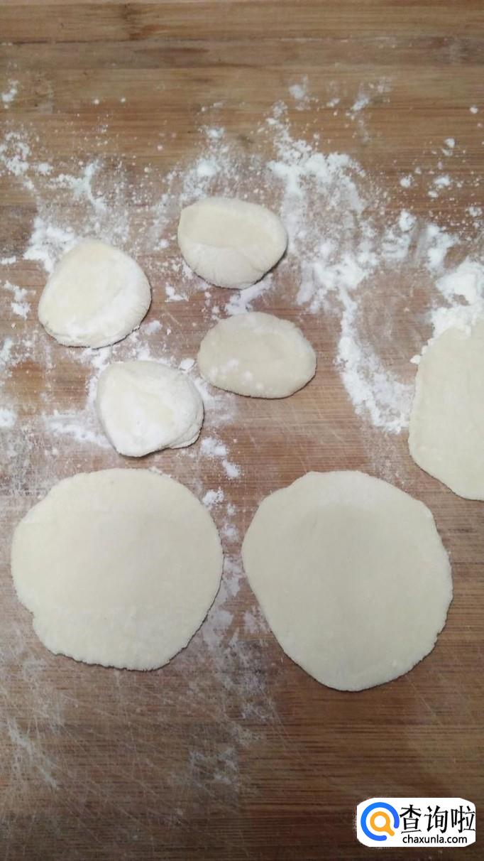 将面团揉成长条,然后分成小剂子,用手按扁,做成饺子皮。