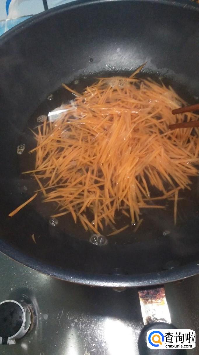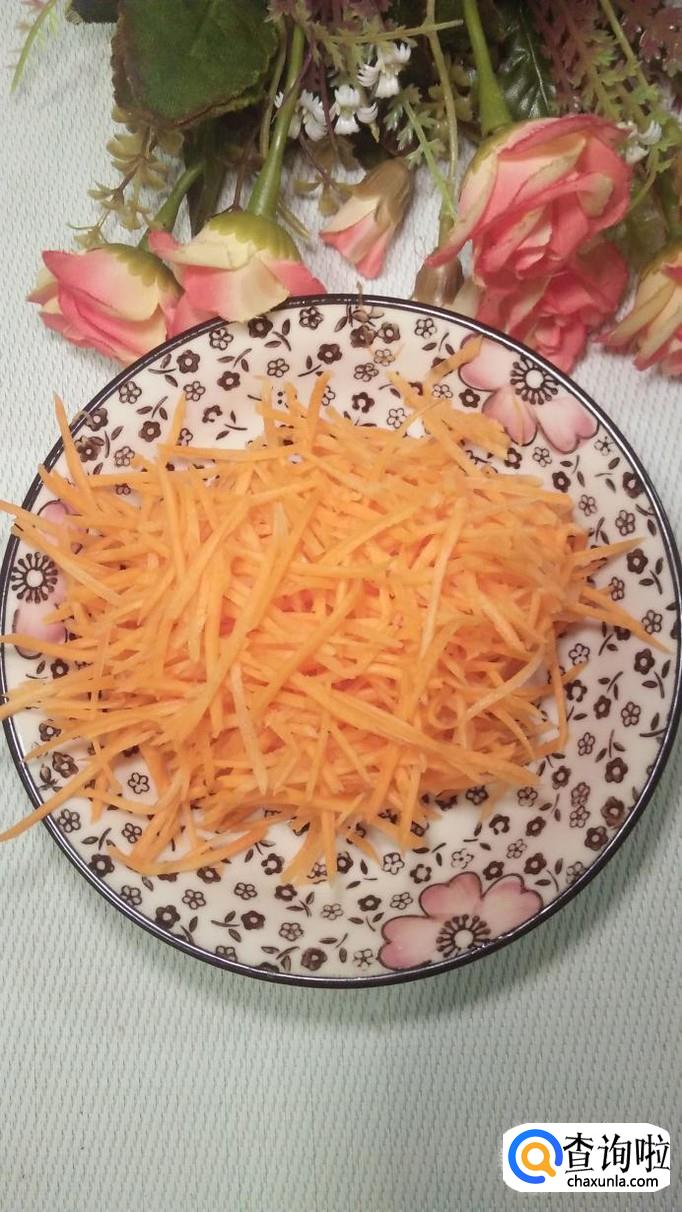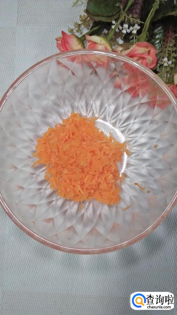准备一根胡萝卜,去皮,擦丝后放入锅中焯水,然后捞出过凉水。