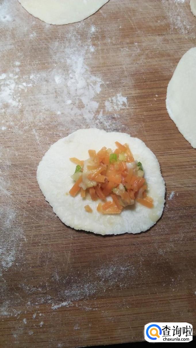 将做好的胡萝卜肉馅放在饺子皮上,用手捏成草帽状,放入盘中备用。