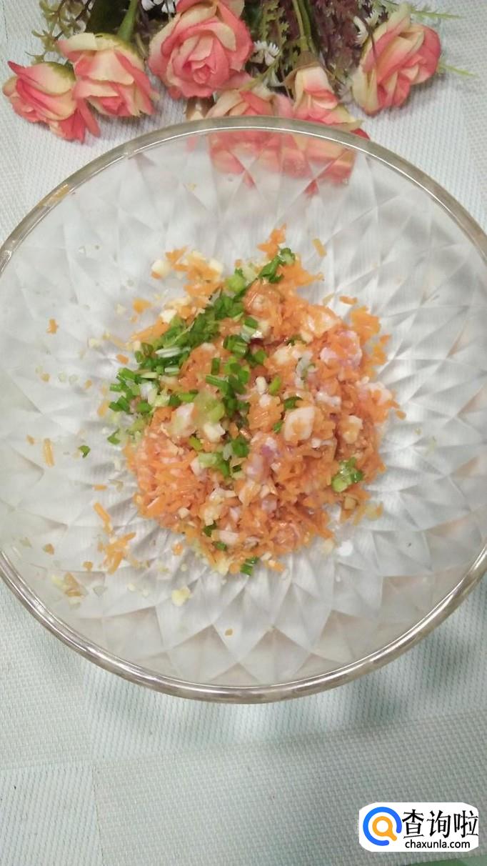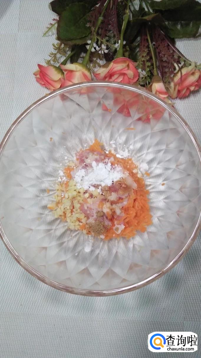 面粉适量,盐适量,胡萝卜适量,小葱适量,五花肉适量,盐适量,鸡精适量,五香粉适量,料酒适量。