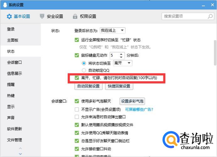 取消勾选“离开、忙碌、请勿打扰时自动回复”即可。