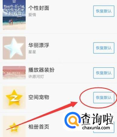 进入之后,将“空间宠物”设置为“恢复默认”即可,如图所示。