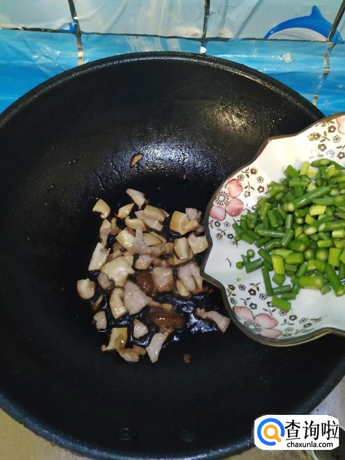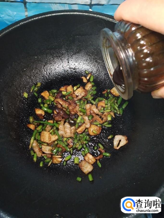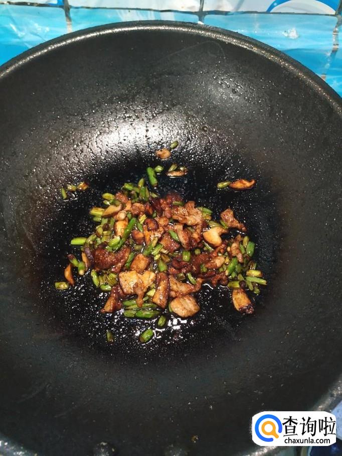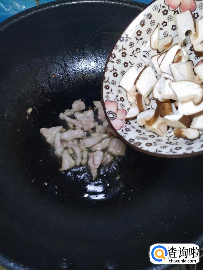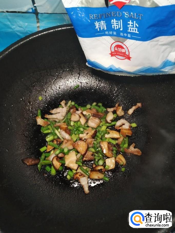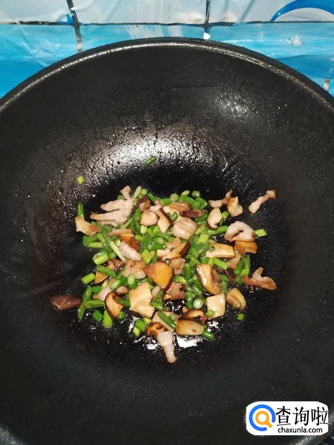 将准备好的香菇丁,蒜苔儿倒入锅中,翻炒均匀。