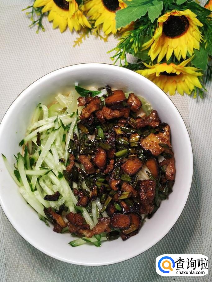 蒜苔适量,五花肉适量,甜面酱适量,黄瓜适量,面条适量,生抽适量,老抽适量,鸡精适量,五香粉适量,青菜适量。
