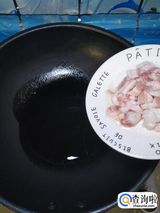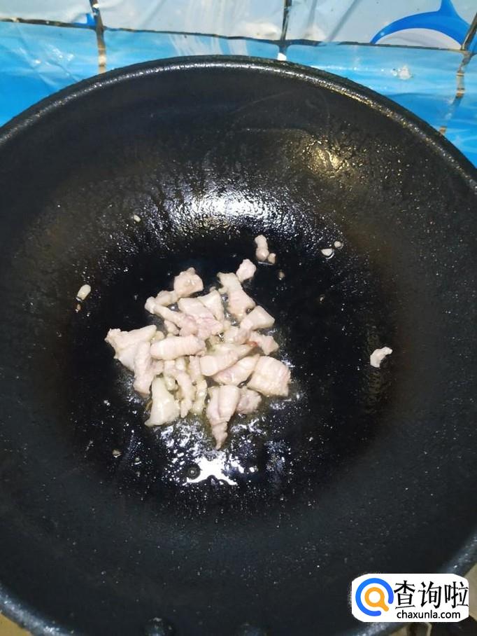 炒锅中放入适量油,油热后,将五花肉倒入锅中炒香。