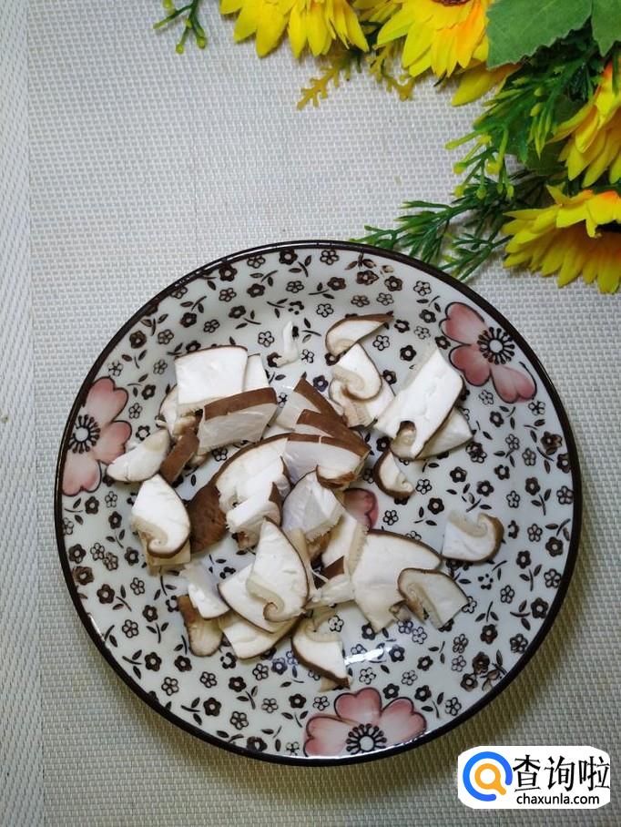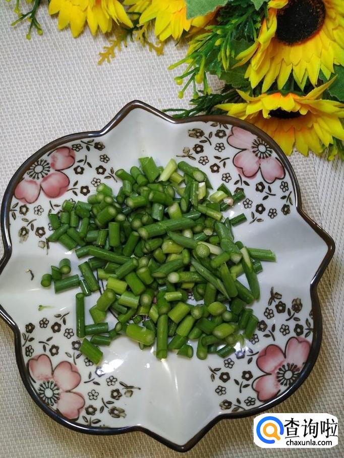 准备适量香菇,洗净后切成块儿;再准备适量蒜薹,洗净后,切丁儿,放入盘中备用。