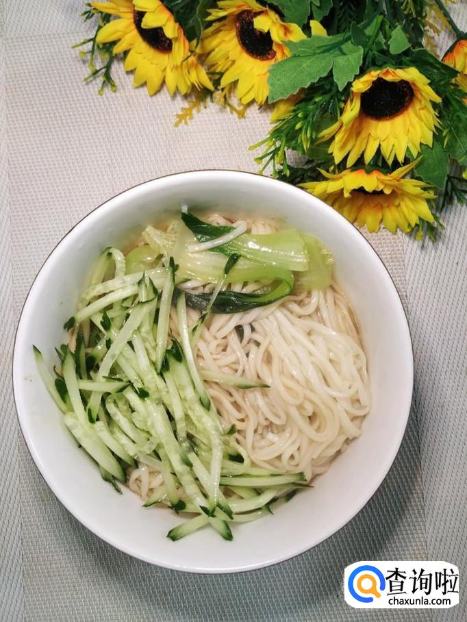 锅中烧开水,水开后将面条和青菜,倒入锅中煮熟,捞入碗中,搅拌均匀,再将之前切好的黄瓜丝放在上面。