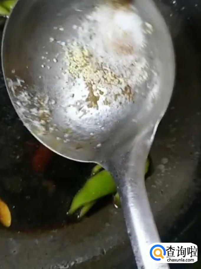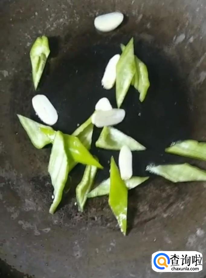 接着我们在锅中留少许底油,放入尖椒,蒜片,炒香