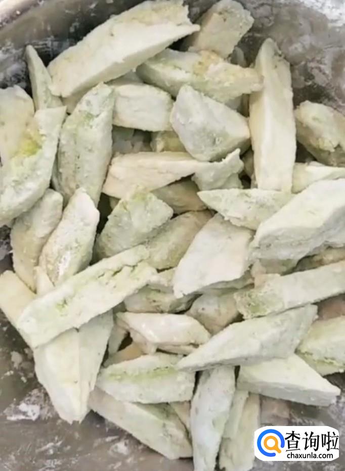 首先我们将茄子清洗干净,切成滚刀块,沾一层水,裹上淀粉备用
