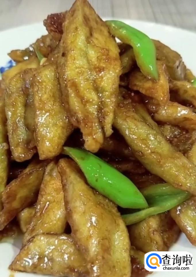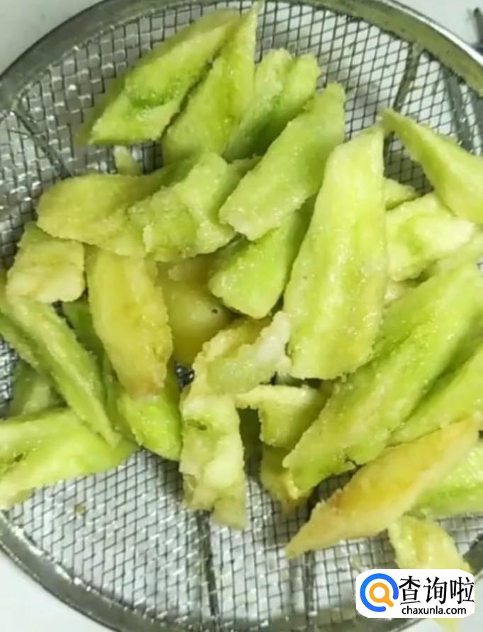 然后我们起锅烧油,油温五成热下入茄子,炸至外表金黄捞出备用