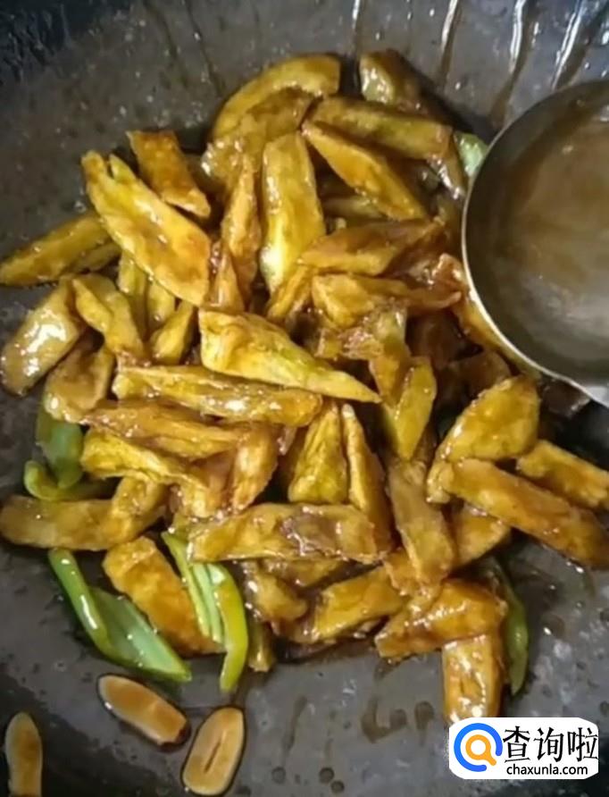 然后我们倒入适量的酱油,蚝油,陈醋,放入盐,鸡精,白糖,再把炸好的茄子放入锅中,翻炒均匀