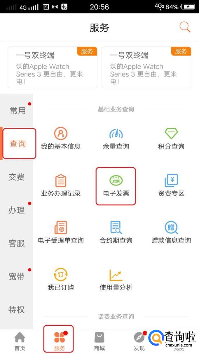 交费之后,如果需要电子发票,我们点击下方“服务”,点击“查询”,就能看到“电子发票”图标。