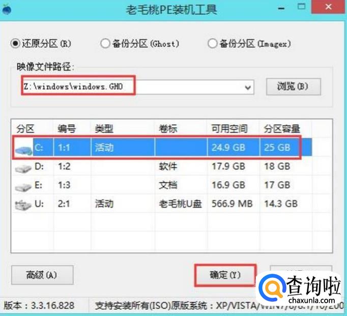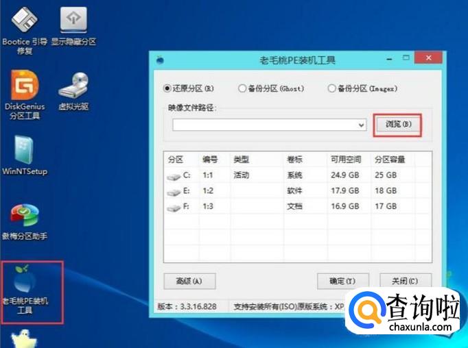 PE启动完成后,我们双击老毛桃PE装机工具,弹出的界面,我们点击浏览;