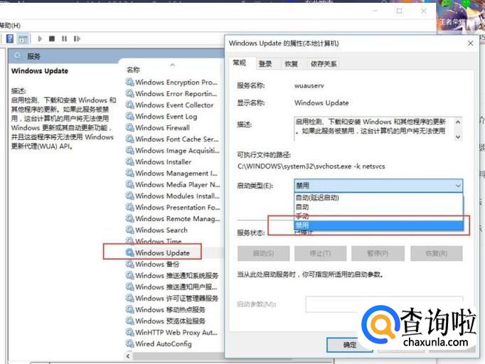 禁用方法:右击鼠标选择属性,在启动类型里选择禁用。