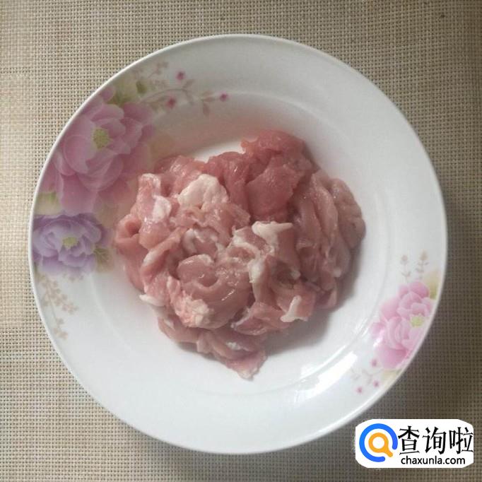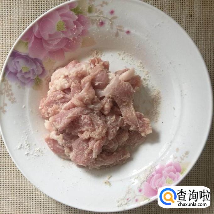 然后把瘦肉切成薄片并用适量的地瓜粉裹一下,如下图所示。
