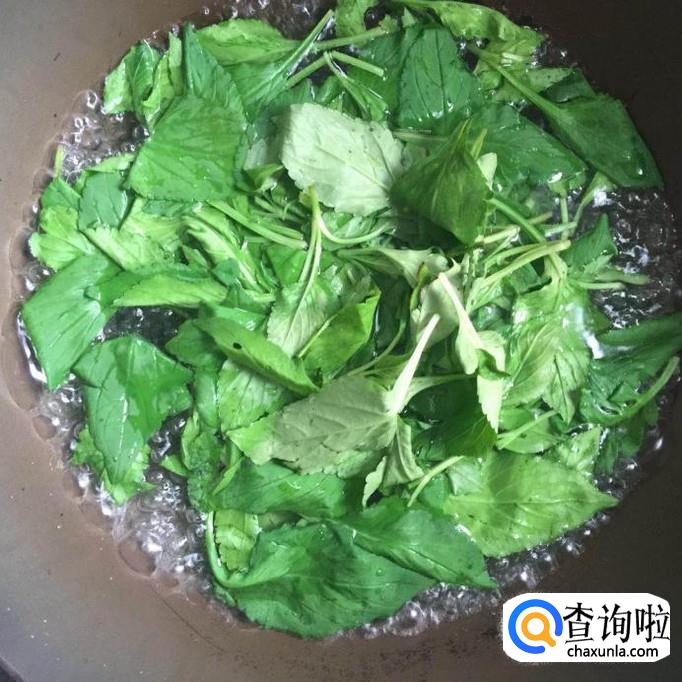 接着锅中放入适量的清水,倒入苦菜煮两分钟,如下图所示。这里要注意的是煮苦菜一定不能煮太久。