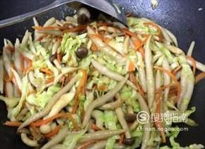 白菜、胡萝卜分别洗净切丝,蟹味菇清水洗净后,下油锅与莜面鱼同炒。
