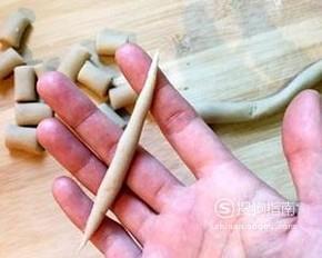 将莜面面团揪小,搓成长条后,取小段揉捏成莜面鱼。