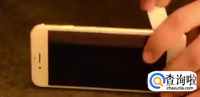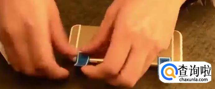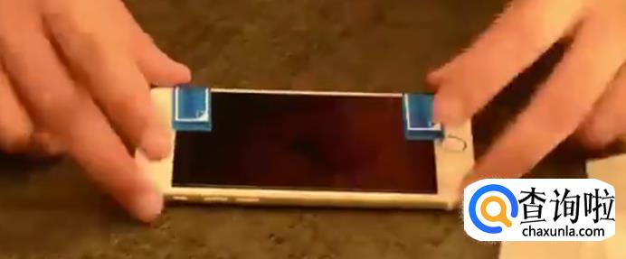 确定手机膜的位置是摆放的,然后把这个定位神器轻轻的粘在膜的一侧,再把另一端粘在手机的一侧,如下图。
