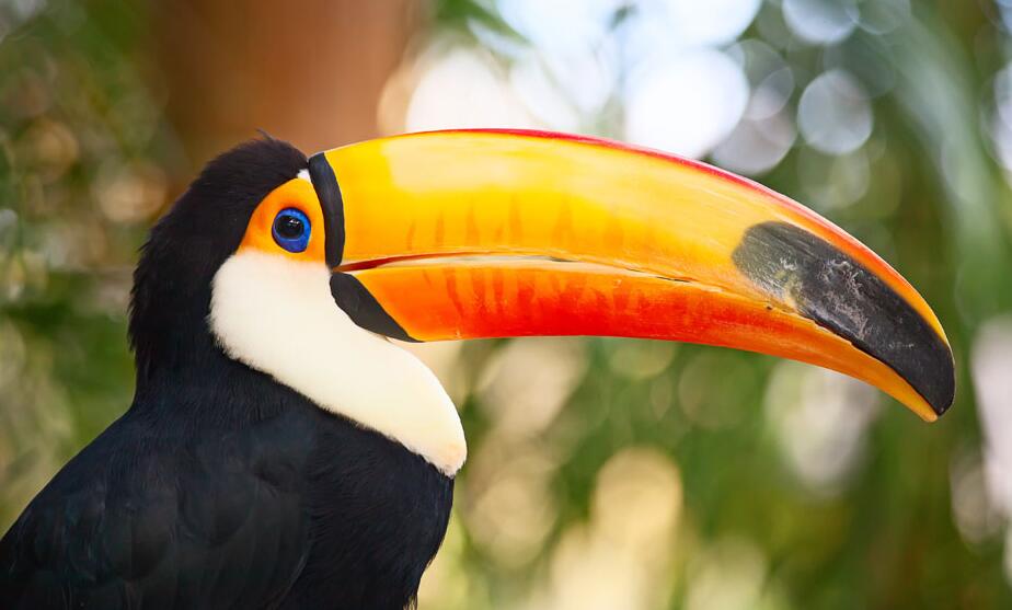 巨嘴鸟体长约67厘米,嘴巨大,长17~24厘米,宽5~9厘米,形似嘴刀,有记录发现最大的嘴长达30厘米,差不多是它们身体的一半了。嘴非常漂亮,上半部黄色,略呈淡绿色,下半部呈蔚蓝色,喙尖点缀着一点殷红。眼睛四周镶嵌着天蓝色羽毛眼圈,胸脯橙黄色,脊部为漆黑色。色彩艳丽和惊人的大喙使其观赏价值极高。主要以果实、种子、昆虫、鸟卵和雏鸡等为食。以树洞营巢。主要分布在南美洲热带森林中,尤以亚马逊河口一带为多。因为这种鸟嘴大的出奇,所以叫它巨嘴鸟,是世界上嘴巴最大的鸟。