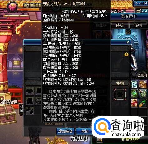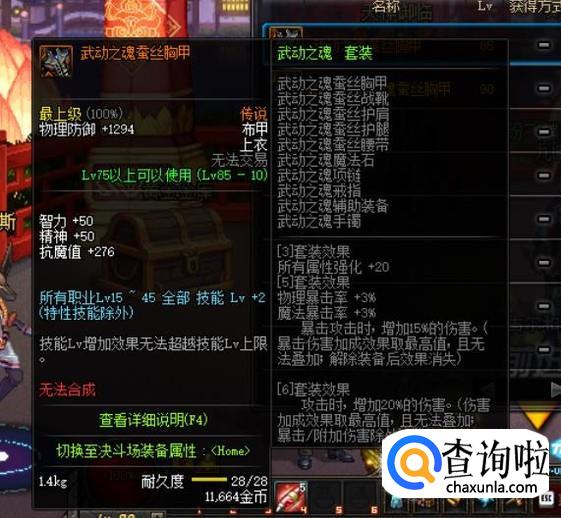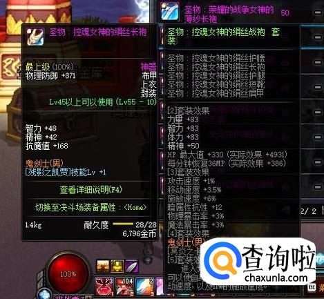 上衣方面,最好的自然是“武动之魂”系列上衣,可以提供2级的BUFF技能等级加成,不过该系列只能使用斗兽场印章进行兑换,获取难度较大;也可以退而求其次的选择55级圣物布甲“控魂女神的绢丝长袍”,【残影之凯贾】技能LV+1,获取较为容易。