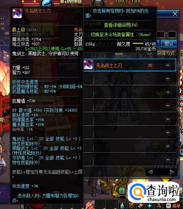 再重点说一下武器方面,85级传说太刀“无名战士之刃”,该装备可以提供高达3级的BUFF技能等级加成。
