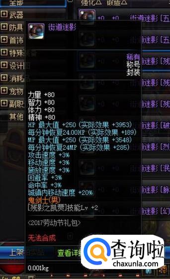 称号方面,提升最大的是2017年的劳动节称号,不过该称号已经绝版,只能通过在拍卖行中进行购买,购买时需注意技能加成种类和技能加成等级。