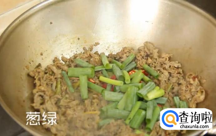 再加入小尖椒、葱绿进行翻炒。