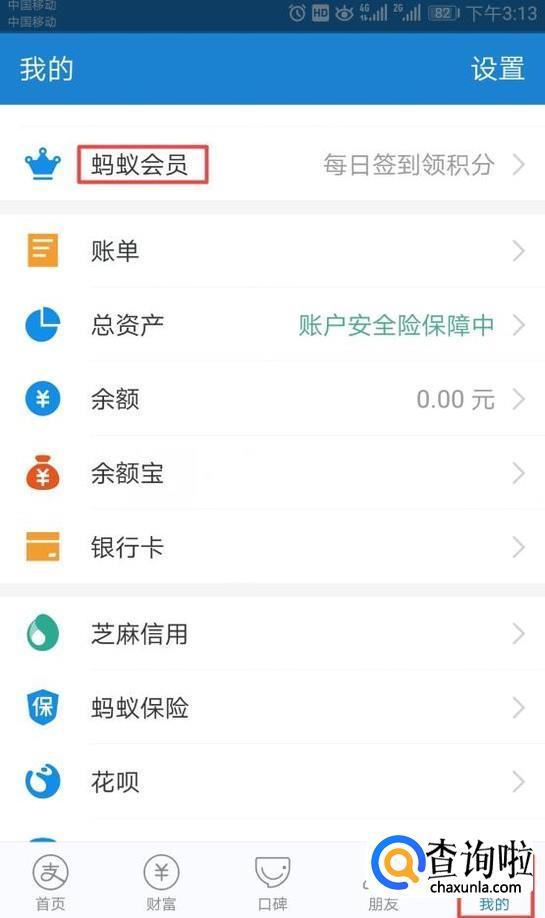 首先,我们打开我们的手机,然后我们点击手机上面的支付宝,进入支付宝之后,我们点击右下角的我的,然后我们点击蚂蚁会员;