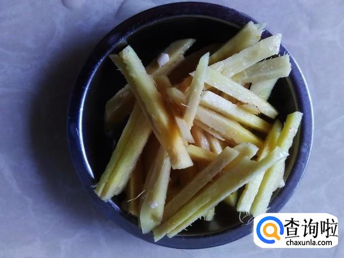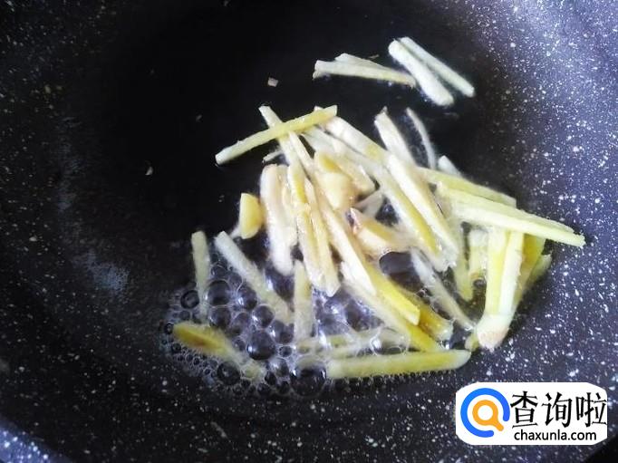再开火下油,放姜丝进去爆出味来,然后把姜丝捞上来。