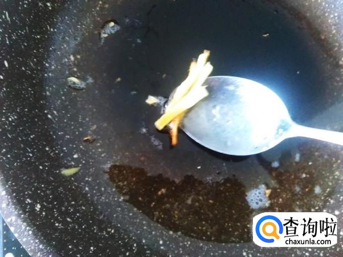 煎至有点焦黄色下一碗水,再把炸过的姜丝放进去,加1勺生抽。