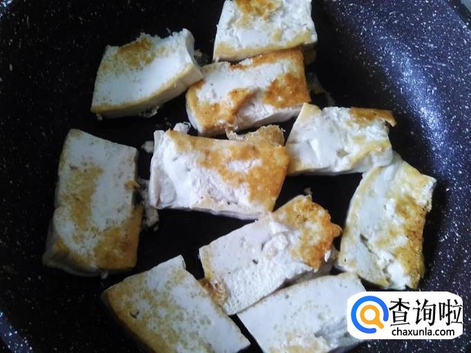 开火下油,把豆腐摆到锅里用小火煎,煎至两面金黄色铲上碟子。