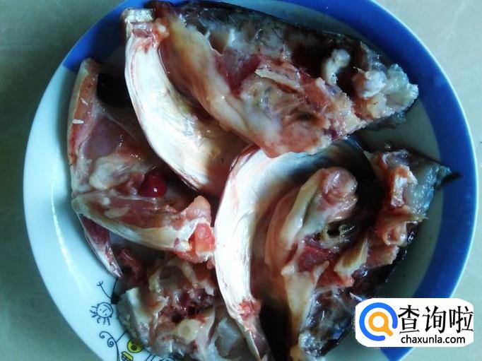 首先把河鱼头清洗干净,然后斩成一块块。