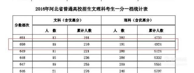 确认高考成绩后,根据自己省份的当年一分一档成绩表格,确认该考生当年高考全省排名情况!这里我们以河北省,高考成绩650分,理科生为例。