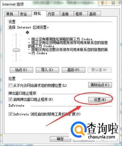 点击【启动弹出窗口阻止程序】旁边的【设置】,如下图所示: