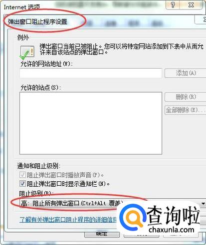 然后【阻止级别】选择【高:阻止所有弹出窗口(Ctrl+Alt覆盖)】就可以了,如下图所示:
