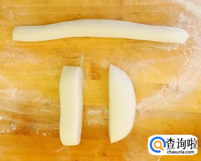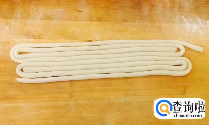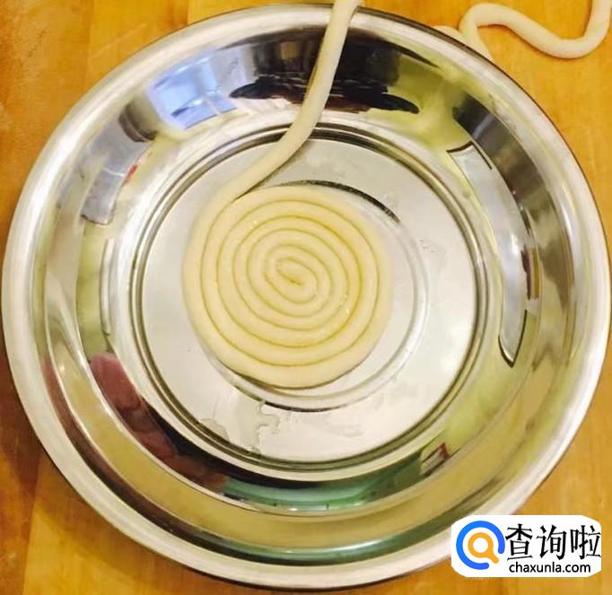 案板铺撒干面粉把醒好的面团切成小块搓成像筷子一样粗细的面条,圆盘底部刷一层花生油把面条盘好再刷一次花生油放置备用