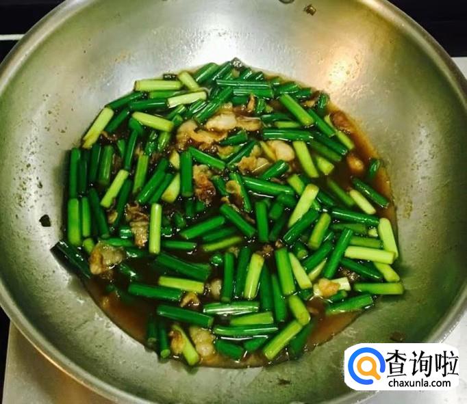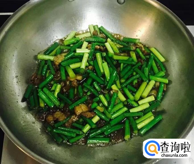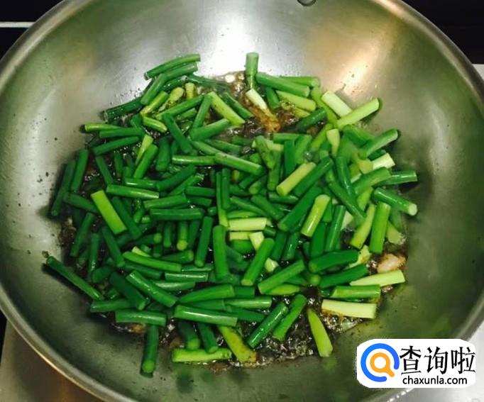 倒入蒜苔段翻炒均匀使蒜苔段吃透油脂