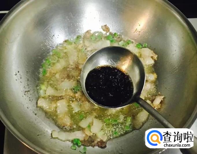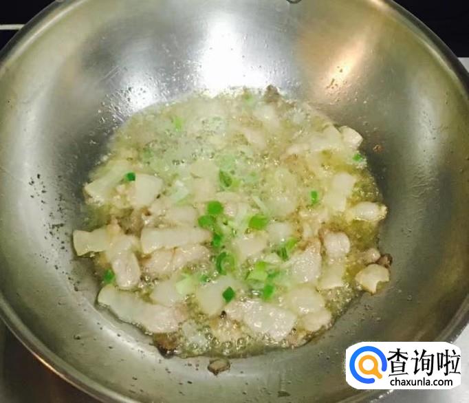 热锅加入适量的花生油把五花肉片炒香并出油,放入葱花爆香,料酒、生抽烹锅