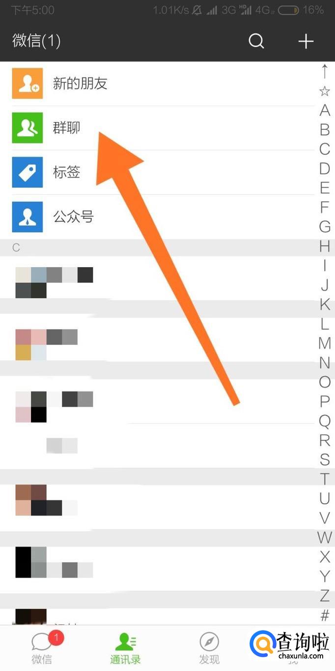 接下来进入到微信通讯录页面,点击进入“群聊”。