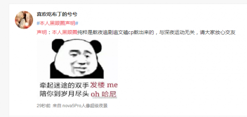 随着此处的分手事件的爆出,不少网友调侃起了自己的黑眼圈,并发搞笑声明证明自己的黑眼圈与夜间“运动”无关。