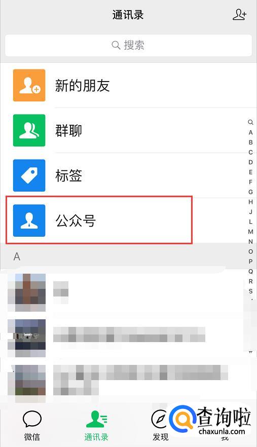 首先打开微信,在【通讯录】中找到【公众号】,如下图所示;